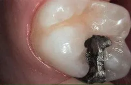 Metal filling with decay, replaced with tooth colored filling, before and after.